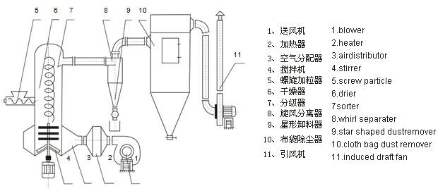 The hot air enters into the bottom of the drier in tangent direction. Under the driving of the stirrer, a powerful rotating wind field is formed.The paste state materials enter into the drier through the screw charger. Under the powerful function of the stirring vanes at high-speed rotation, the materials are distributed under the function of strike, friction and shearing force. The block state mate-rials will soon be smashed and contact the hot air fully and the materials are heated and dried. The dried materials after the dewatering will g o up with the heatair flow. The step rings will stop and keep the big particles. Small particles will be discharged out of the drier from the ring center and will be restored by the whirl separator and dust remover. The not-fully-dried or big piece materials will be sent to the wall of the equipment by centrifugal force function and be smashed again after they fall down to the bottom.