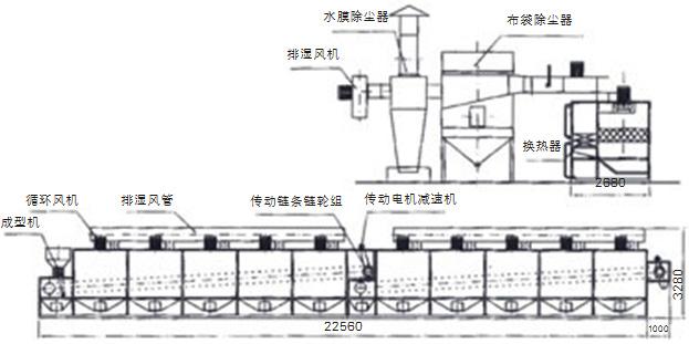 本機(jī)是我公司根據(jù)染料等物料壓率后高水分狀固有的特性,設(shè)計(jì)出的新型改進(jìn)型網(wǎng)帶式干燥機(jī),一般熱源等放置于右側(cè),工作時(shí),物料先進(jìn)入成形預(yù)熱機(jī)構(gòu),擠條造粒,同時(shí)也被脫去一部分水分,之后均勻分布在網(wǎng)帶上,干燥時(shí),物料從網(wǎng)帶的上方和下方強(qiáng)制輸入熱風(fēng),使被干燥的每個(gè)粒子表面都成為受熱面,增大物料與熱風(fēng)的接觸面積顯著增加導(dǎo)熱面積,使物料內(nèi)部水份擴(kuò)散。組合成的配合使其效率更高,節(jié)能性更好 。